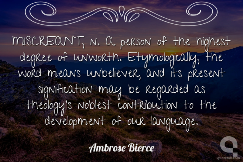MISCREANT, n. A person of the highest degree of unworth. Etymologically, the word means unbeliever, and its present signification may be regarded as theology's noblest contribution to the development of our language.