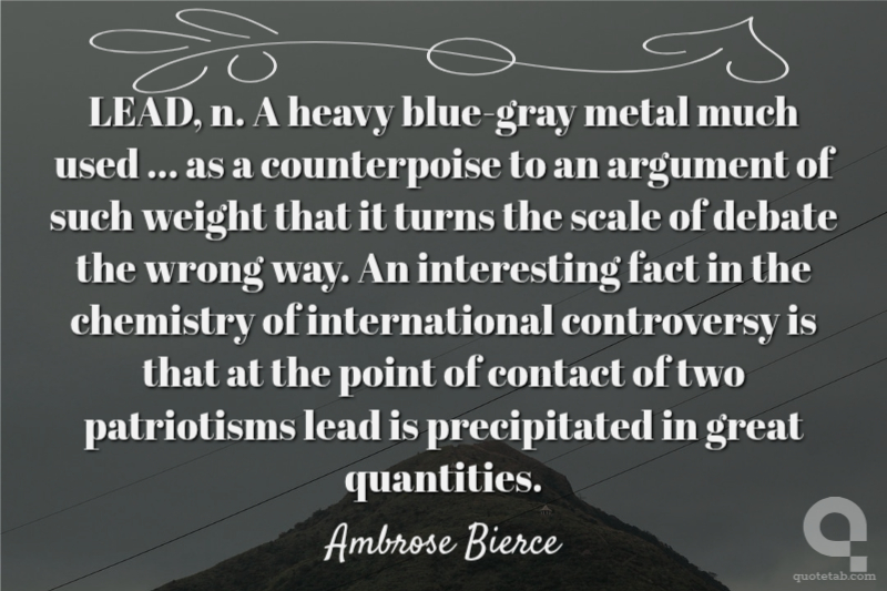 LEAD, n. A heavy blue-gray metal much used ... as a counterpoise to an argument of such weight that it turns the scale of debate the wrong way. An interesting fact in the chemistry of international controversy is that at the point of contact of two patriotisms lead is precipitated in great quantities.