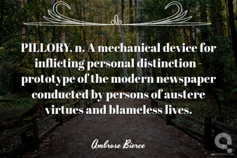 PILLORY, n. A mechanical device for inflicting personal distinction - prototype of the modern newspaper conducted by persons of austere virtues and blameless lives.
