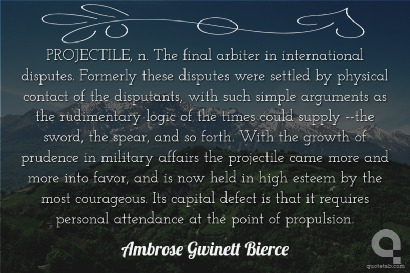 PROJECTILE, n. The final arbiter in international disputes. Formerly these disputes were settled by physical contact of the disputants, with such simple arguments as the rudimentary logic of the times could supply --the sword, the spear, and so forth. With the growth of prudence in military affairs the projectile came more and more into favor, and is now held in high esteem by the most courageous. Its capital defect is that it requires personal attendance at the point of propulsion.
