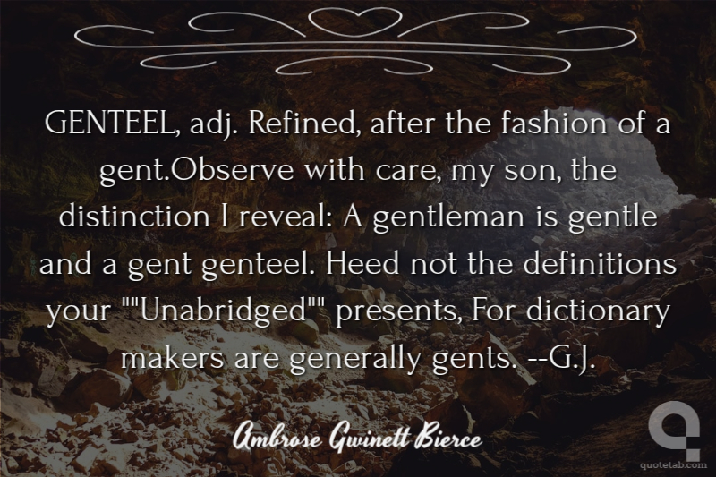 GENTEEL, adj. Refined, after the fashion of a gent.Observe with care, my son, the distinction I reveal: A gentleman is gentle and a gent genteel. Heed not the definitions your ""Unabridged"" presents, For dictionary makers are generally gents. --G.J.