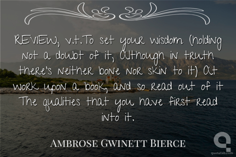 REVIEW, v.t.To set your wisdom (holding not a doubt of it, Although in truth there's neither bone nor skin to it) At work upon a book, and so read out of it The qualities that you have first read into it.