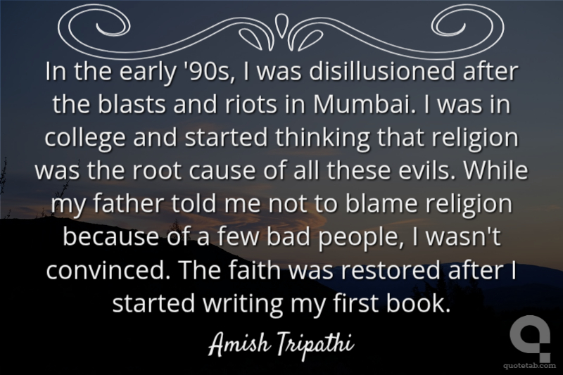 In the early '90s, I was disillusioned after the blasts and riots in Mumbai. I was in college and started thinking that religion was the root cause of all these evils. While my father told me not to blame religion because of a few bad people, I wasn't convinced. The faith was restored after I started writing my first book.