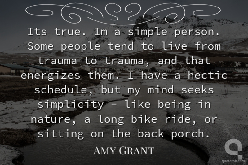 Its true. Im a simple person. Some people tend to live from trauma to trauma, and that energizes them. I have a hectic schedule, but my mind seeks simplicity - like being in nature, a long bike ride, or sitting on the back porch.