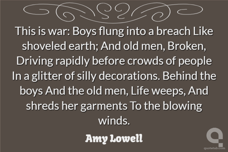 This is war: Boys flung into a breach Like shoveled earth; And old men, Broken, Driving rapidly before crowds of people In a glitter of silly decorations. Behind the boys And the old men, Life weeps, And shreds her garments To the blowing winds.