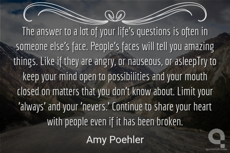 The answer to a lot of your life's questions is often in someone else's face. People's faces will tell you amazing things. Like if they are angry, or nauseous, or asleepTry to keep your mind open to possibilities and your mouth closed on matters that you don't know about. Limit your 'always' and your 'nevers.' Continue to share your heart with people even if it has been broken.