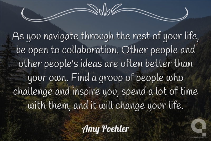 As you navigate through the rest of your life, be open to collaboration. Other people and other people's ideas are often better than your own. Find a group of people who challenge and inspire you, spend a lot of time with them, and it will change your life.