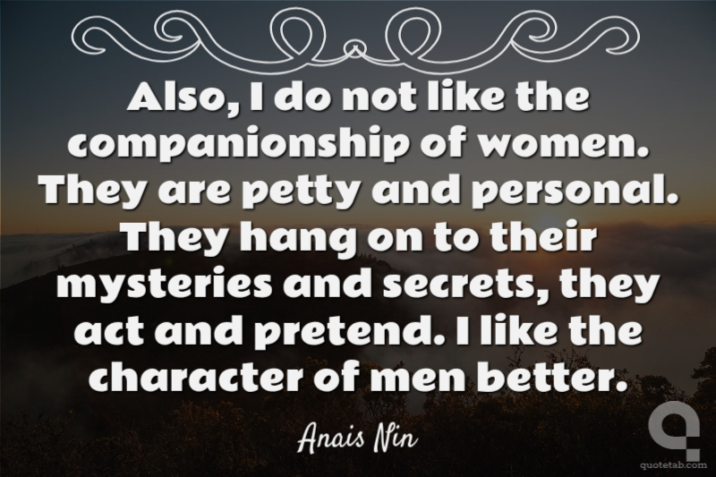 Also, I do not like the companionship of women. They are petty and personal. They hang on to their mysteries and secrets, they act and pretend. I like the character of men better.