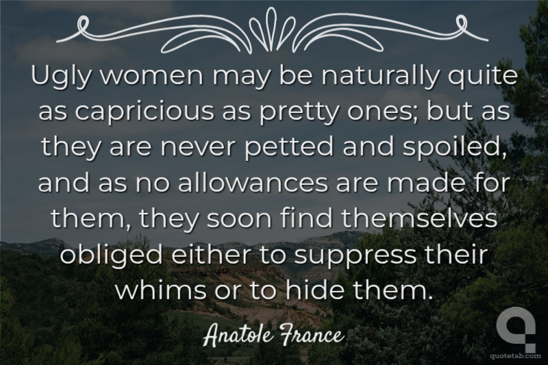 Ugly women may be naturally quite as capricious as pretty ones; but as they are never petted and spoiled, and as no allowances are made for them, they soon find themselves obliged either to suppress their whims or to hide them.