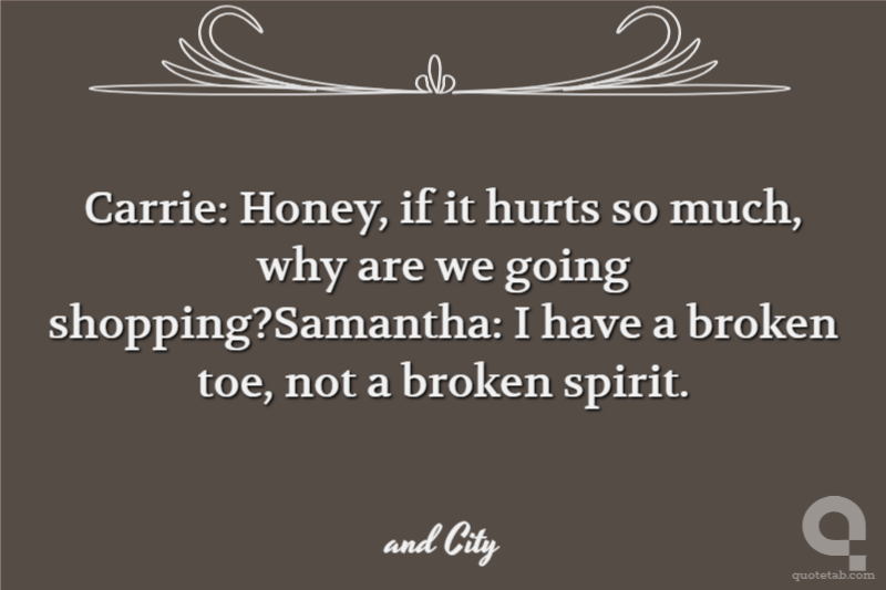 Carrie: Honey, if it hurts so much, why are we going shopping?Samantha: I have a broken toe, not a broken spirit.