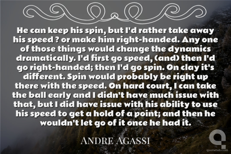 He can keep his spin, but I'd rather take away his speed ? or make him right-handed. Any one of those things would change the dynamics dramatically. I'd first go speed, (and) then I'd go right-handed; then I'd go spin. On clay it's different. Spin would probably be right up there with the speed. On hard court, I can take the ball early and I didn't have much issue with that, but I did have issue with his ability to use his speed to get a hold of a point; and then he wouldn't let go of it once he had it.