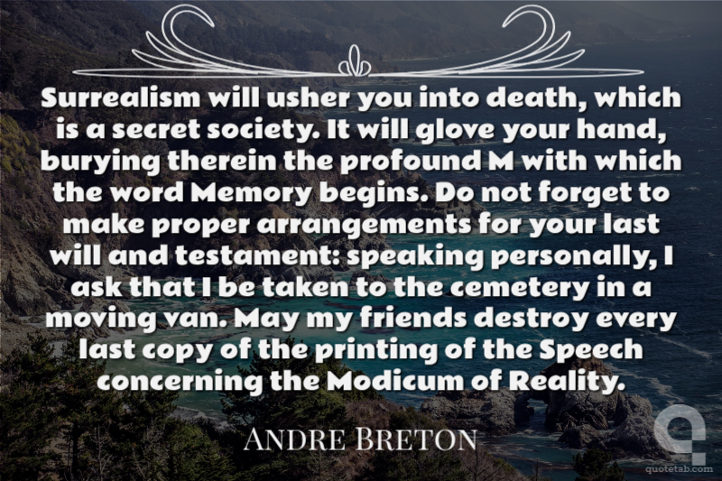 Surrealism will usher you into death, which is a secret society. It will glove your hand, burying therein the profound M with which the word Memory begins. Do not forget to make proper arrangements for your last will and testament: speaking personally, I ask that I be taken to the cemetery in a moving van. May my friends destroy every last copy of the printing of the Speech concerning the Modicum of Reality.