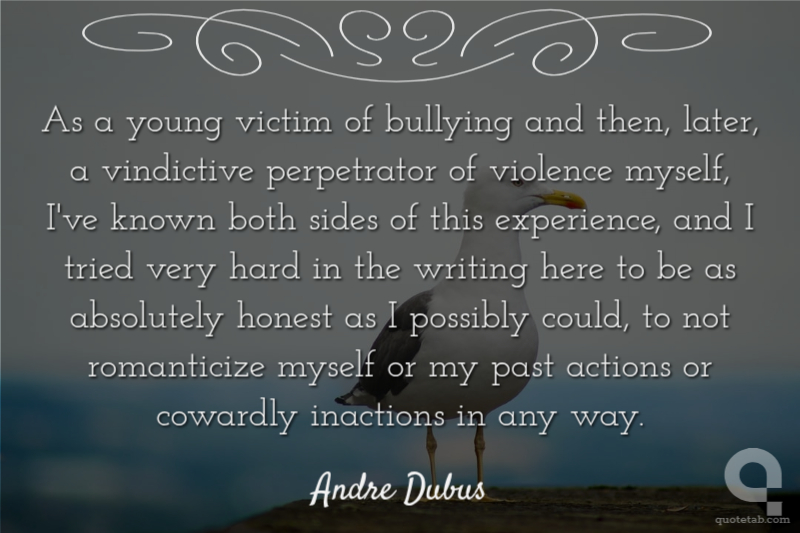 As a young victim of bullying and then, later, a vindictive perpetrator of violence myself, I've known both sides of this experience, and I tried very hard in the writing here to be as absolutely honest as I possibly could, to not romanticize myself or my past actions or cowardly inactions in any way.