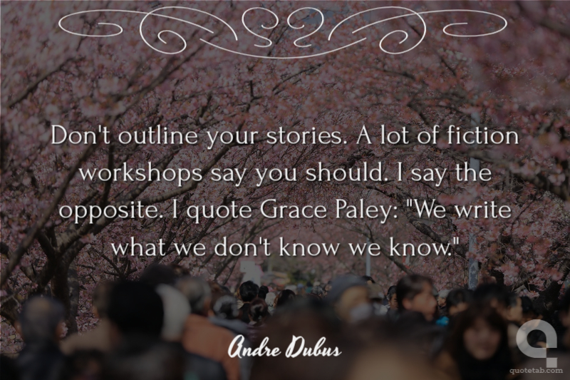 Don't outline your stories. A lot of fiction workshops say you should. I say the opposite. I quote Grace Paley: "We write what we don't know we know."