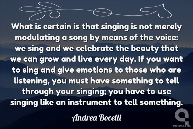 What is certain is that singing is not merely modulating a song by means of the voice: we sing and we celebrate the beauty that we can grow and live every day. If you want to sing and give emotions to those who are listening, you must have something to tell through your singing; you have to use singing like an instrument to tell something.