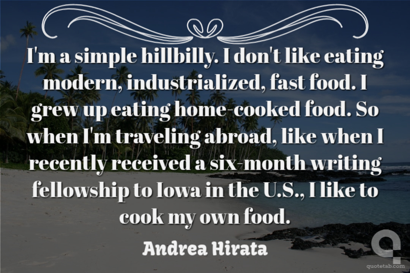 I'm a simple hillbilly. I don't like eating modern, industrialized, fast food. I grew up eating home-cooked food. So when I'm traveling abroad, like when I recently received a six-month writing fellowship to Iowa in the U.S., I like to cook my own food.