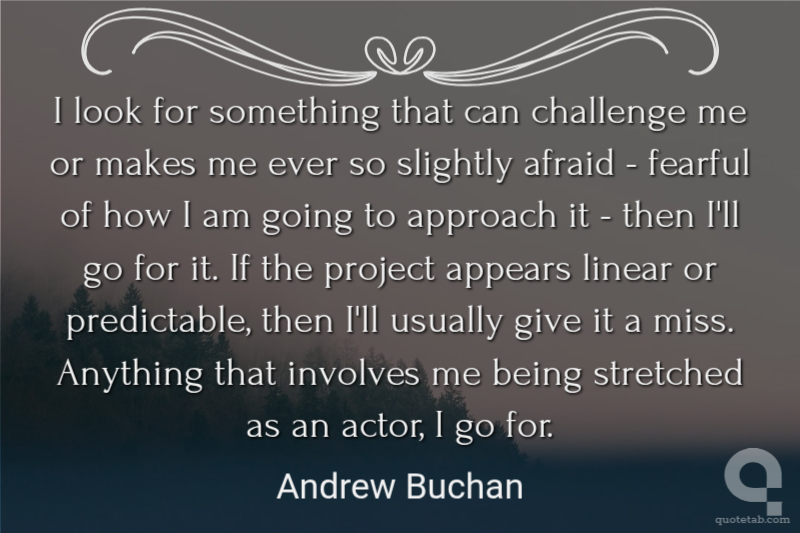 I look for something that can challenge me or makes me ever so slightly afraid - fearful of how I am going to approach it - then I'll go for it. If the project appears linear or predictable, then I'll usually give it a miss. Anything that involves me being stretched as an actor, I go for.