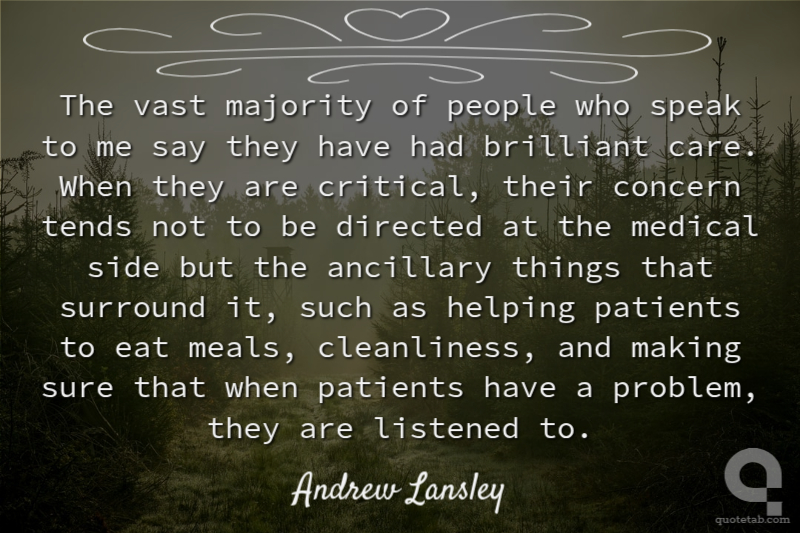 The vast majority of people who speak to me say they have had brilliant care. When they are critical, their concern tends not to be directed at the medical side but the ancillary things that surround it, such as helping patients to eat meals, cleanliness, and making sure that when patients have a problem, they are listened to.