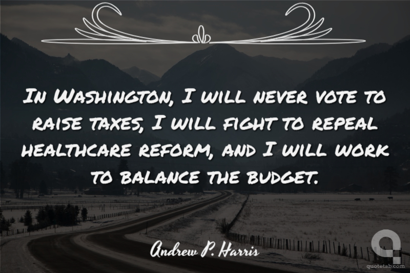 In Washington, I will never vote to raise taxes, I will fight to repeal healthcare reform, and I will work to balance the budget.