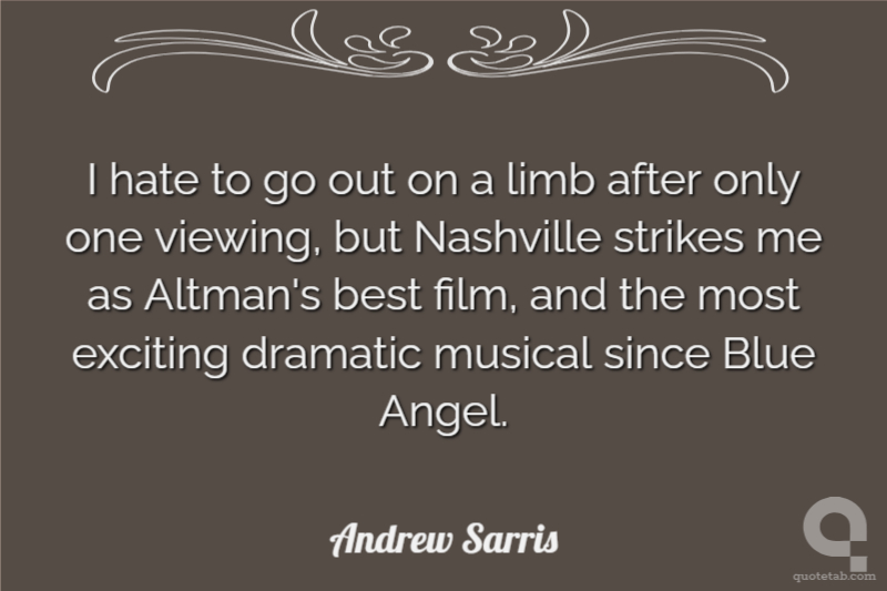 I hate to go out on a limb after only one viewing, but Nashville strikes me as Altman's best film, and the most exciting dramatic musical since Blue Angel.