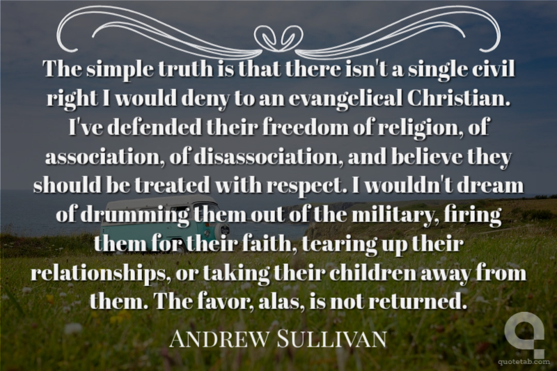 The simple truth is that there isn't a single civil right I would deny to an evangelical Christian. I've defended their freedom of religion, of association, of disassociation, and believe they should be treated with respect. I wouldn't dream of drumming them out of the military, firing them for their faith, tearing up their relationships, or taking their children away from them. The favor, alas, is not returned.