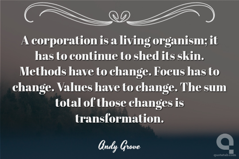 A corporation is a living organism; it has to continue to shed its skin. Methods have to change. Focus has to change. Values have to change. The sum total of those changes is transformation.
