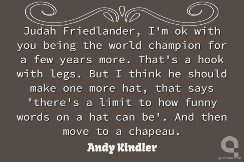 Judah Friedlander, I'm ok with you being the world champion for a few years more. That's a hook with legs. But I think he should make one more hat, that says 'there's a limit to how funny words on a hat can be'. And then move to a chapeau.