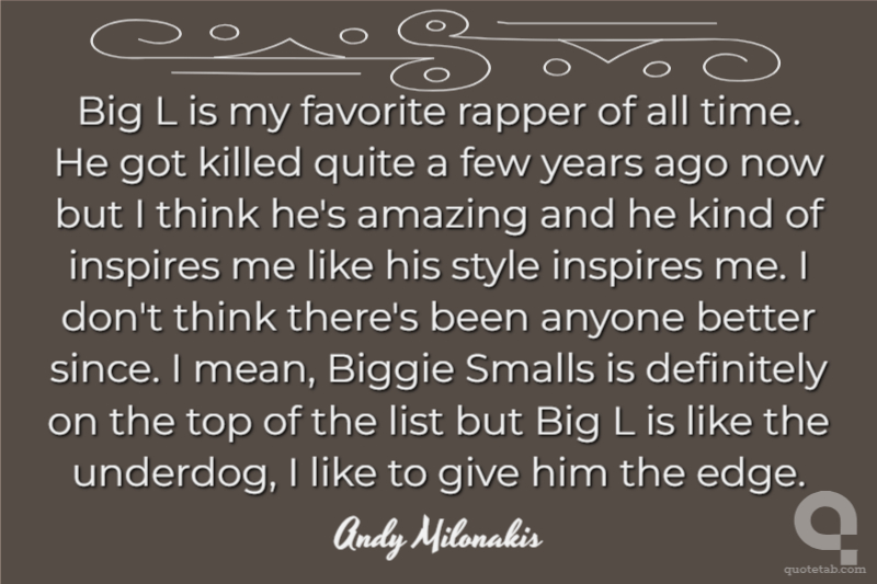 Big L is my favorite rapper of all time. He got killed quite a few years ago now but I think he's amazing and he kind of inspires me like his style inspires me. I don't think there's been anyone better since. I mean, Biggie Smalls is definitely on the top of the list but Big L is like the underdog, I like to give him the edge.