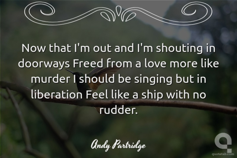 Now that I'm out and I'm shouting in doorways Freed from a love more like murder I should be singing but in liberation Feel like a ship with no rudder.