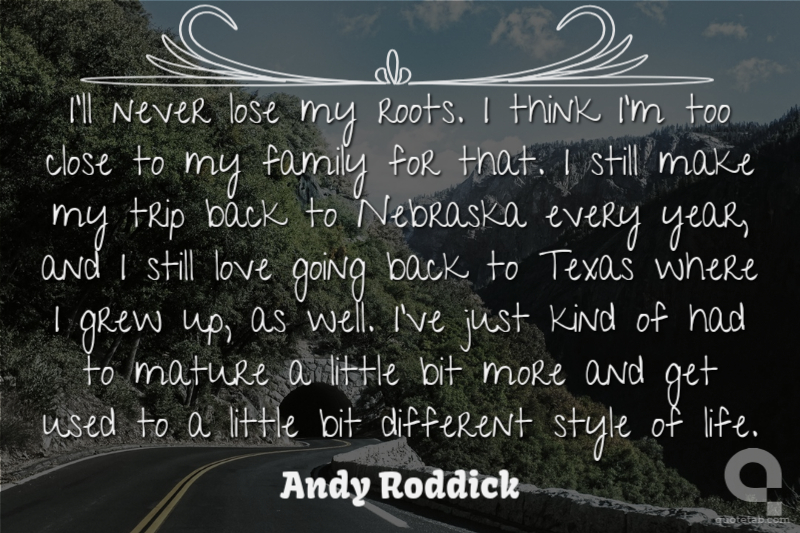 I'll never lose my roots. I think I'm too close to my family for that. I still make my trip back to Nebraska every year, and I still love going back to Texas where I grew up, as well. I've just kind of had to mature a little bit more and get used to a little bit different style of life.