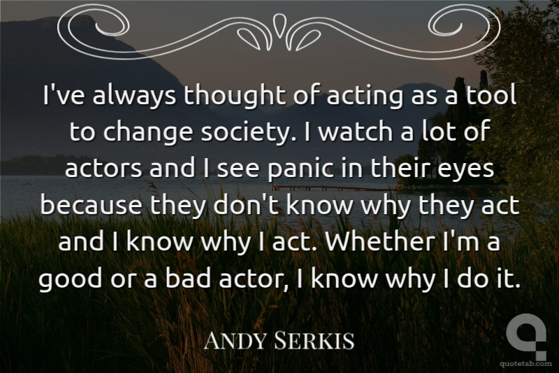 I've always thought of acting as a tool to change society. I watch a lot of actors and I see panic in their eyes because they don't know why they act and I know why I act. Whether I'm a good or a bad actor, I know why I do it.