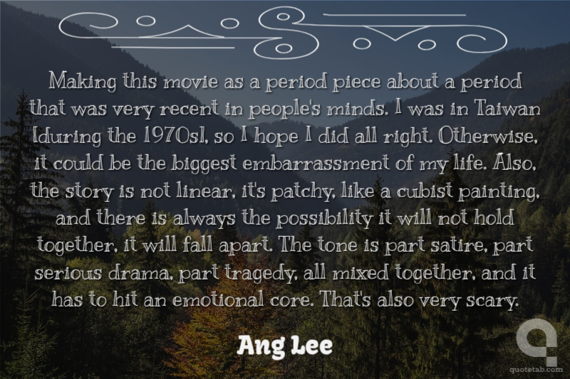 Making this movie as a period piece about a period that was very recent in people's minds. I was in Taiwan [during the 1970s], so I hope I did all right. Otherwise, it could be the biggest embarrassment of my life. Also, the story is not linear, it's patchy, like a cubist painting, and there is always the possibility it will not hold together, it will fall apart. The tone is part satire, part serious drama, part tragedy, all mixed together, and it has to hit an emotional core. That's also very scary.