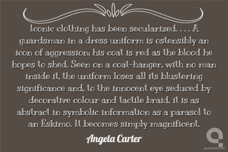 Iconic clothing has been secularized. . . . A guardsman in a dress uniform is ostensibly an icon of aggression; his coat is red as the blood he hopes to shed. Seen on a coat-hanger, with no man inside it, the uniform loses all its blustering significance and, to the innocent eye seduced by decorative colour and tactile braid, it is as abstract in symbolic information as a parasol to an Eskimo. It becomes simply magnificent.