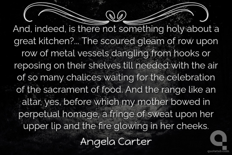 And, indeed, is there not something holy about a great kitchen?... The scoured gleam of row upon row of metal vessels dangling from hooks or reposing on their shelves till needed with the air of so many chalices waiting for the celebration of the sacrament of food. And the range like an altar, yes, before which my mother bowed in perpetual homage, a fringe of sweat upon her upper lip and the fire glowing in her cheeks.