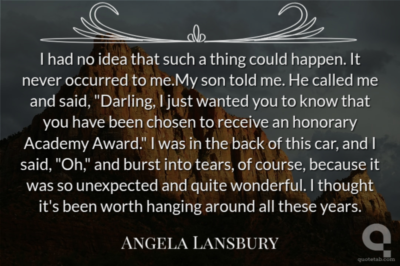 I had no idea that such a thing could happen. It never occurred to me.My son told me. He called me and said, "Darling, I just wanted you to know that you have been chosen to receive an honorary Academy Award." I was in the back of this car, and I said, "Oh," and burst into tears, of course, because it was so unexpected and quite wonderful. I thought it's been worth hanging around all these years.