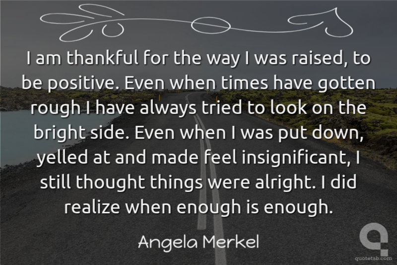 I am thankful for the way I was raised, to be positive. Even when times have gotten rough I have always tried to look on the bright side. Even when I was put down, yelled at and made feel insignificant, I still thought things were alright. I did realize when enough is enough.