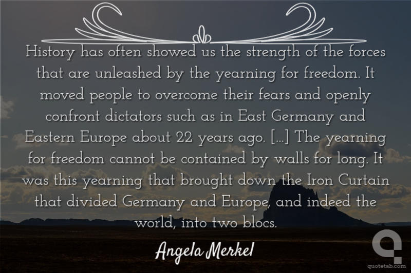 History has often showed us the strength of the forces that are unleashed by the yearning for freedom. It moved people to overcome their fears and openly confront dictators such as in East Germany and Eastern Europe about 22 years ago. [...] The yearning for freedom cannot be contained by walls for long. It was this yearning that brought down the Iron Curtain that divided Germany and Europe, and indeed the world, into two blocs.