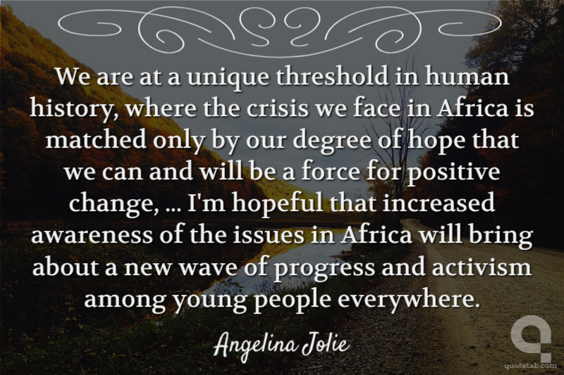 We are at a unique threshold in human history, where the crisis we face in Africa is matched only by our degree of hope that we can and will be a force for positive change, ... I'm hopeful that increased awareness of the issues in Africa will bring about a new wave of progress and activism among young people everywhere.