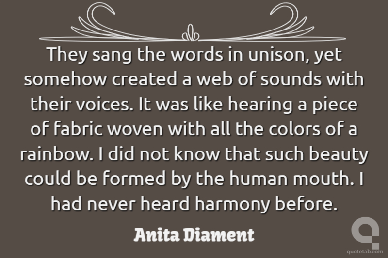 They sang the words in unison, yet somehow created a web of sounds with their voices. It was like hearing a piece of fabric woven with all the colors of a rainbow. I did not know that such beauty could be formed by the human mouth. I had never heard harmony before.