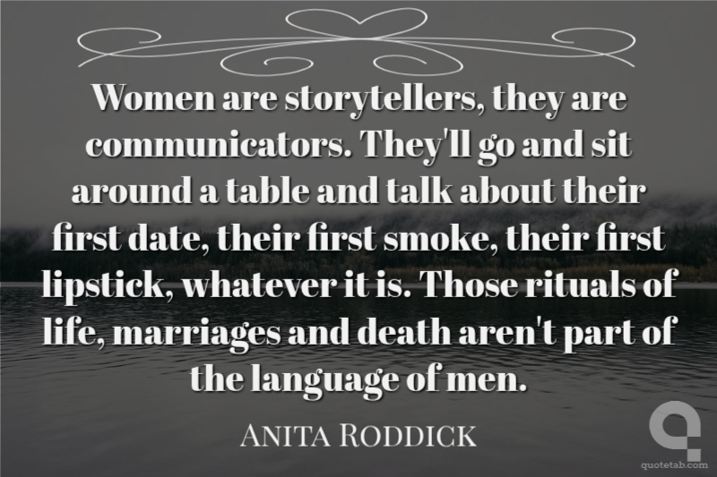 Women are storytellers, they are communicators. They'll go and sit around a table and talk about their first date, their first smoke, their first lipstick, whatever it is. Those rituals of life, marriages and death aren't part of the language of men.