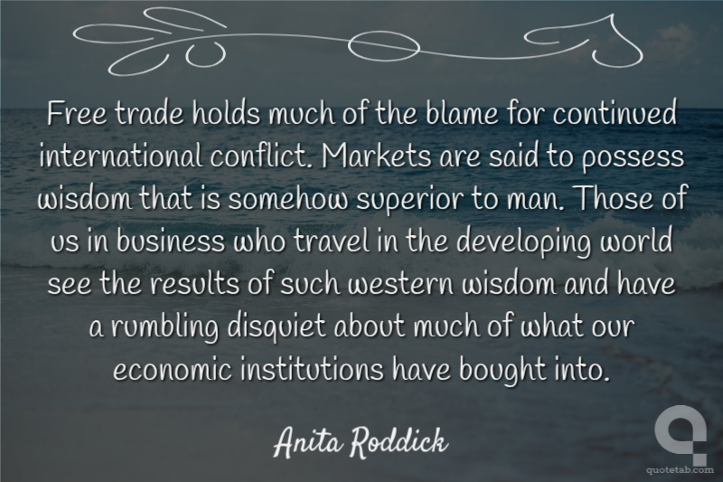 Free trade holds much of the blame for continued international conflict. Markets are said to possess wisdom that is somehow superior to man. Those of us in business who travel in the developing world see the results of such western wisdom and have a rumbling disquiet about much of what our economic institutions have bought into.