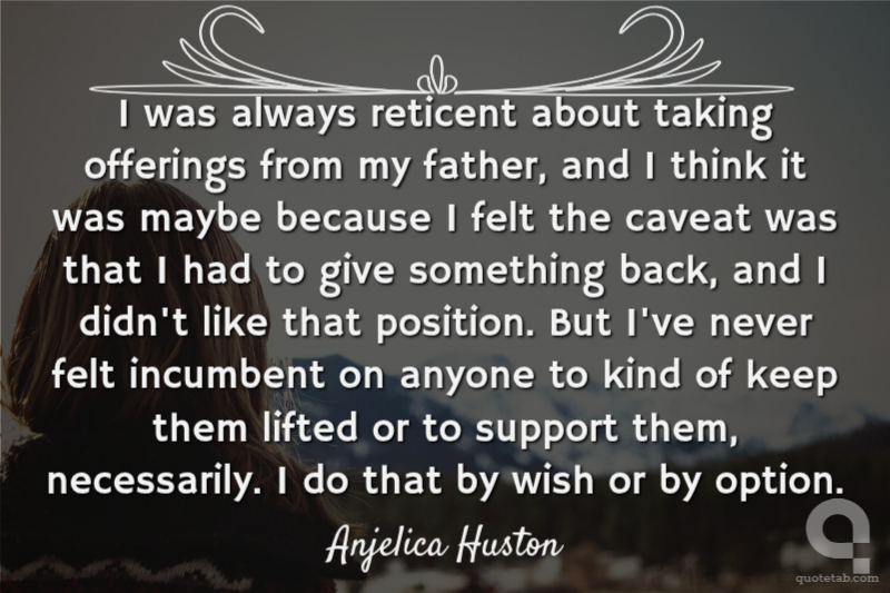 I was always reticent about taking offerings from my father, and I think it was maybe because I felt the caveat was that I had to give something back, and I didn't like that position. But I've never felt incumbent on anyone to kind of keep them lifted or to support them, necessarily. I do that by wish or by option.