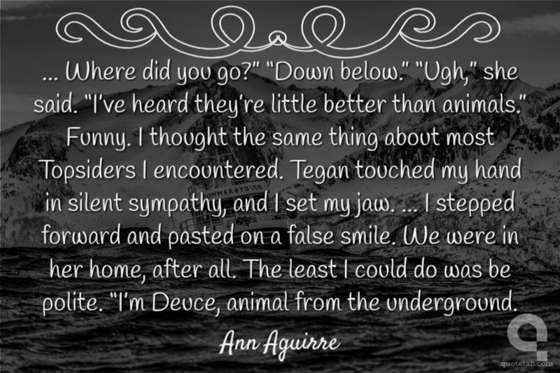 ... Where did you go?” “Down below.” “Ugh,” she said. “I’ve heard they’re little better than animals.” Funny. I thought the same thing about most Topsiders I encountered. Tegan touched my hand in silent sympathy, and I set my jaw. ... I stepped forward and pasted on a false smile. We were in her home, after all. The least I could do was be polite. “I’m Deuce, animal from the underground.