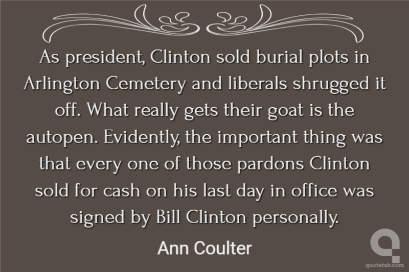 As president, Clinton sold burial plots in Arlington Cemetery and liberals shrugged it off. What really gets their goat is the autopen. Evidently, the important thing was that every one of those pardons Clinton sold for cash on his last day in office was signed by Bill Clinton personally.
