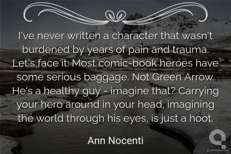 I've never written a character that wasn't burdened by years of pain and trauma. Let's face it: Most comic-book heroes have some serious baggage. Not Green Arrow. He's a healthy guy - imagine that? Carrying your hero around in your head, imagining the world through his eyes, is just a hoot.