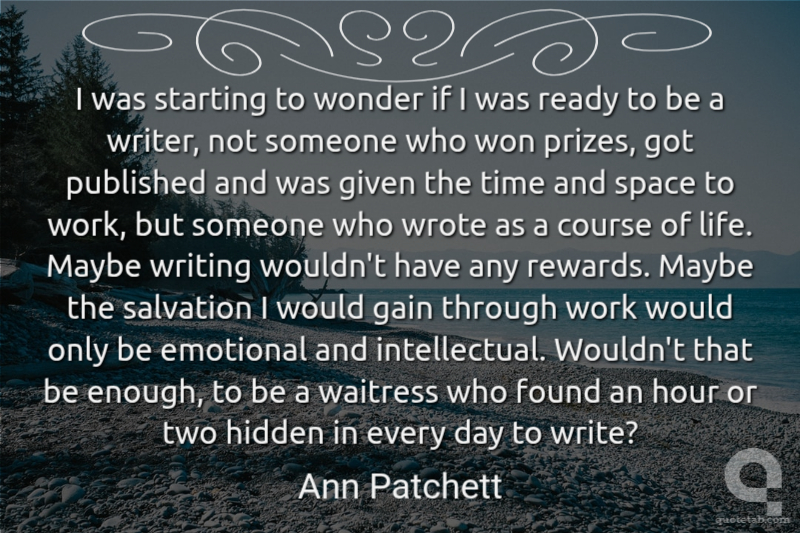 I was starting to wonder if I was ready to be a writer, not someone who won prizes, got published and was given the time and space to work, but someone who wrote as a course of life. Maybe writing wouldn't have any rewards. Maybe the salvation I would gain through work would only be emotional and intellectual. Wouldn't that be enough, to be a waitress who found an hour or two hidden in every day to write?
