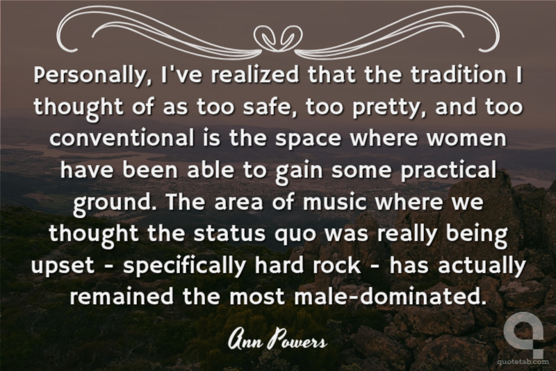 Personally, I've realized that the tradition I thought of as too safe, too pretty, and too conventional is the space where women have been able to gain some practical ground. The area of music where we thought the status quo was really being upset - specifically hard rock - has actually remained the most male-dominated.