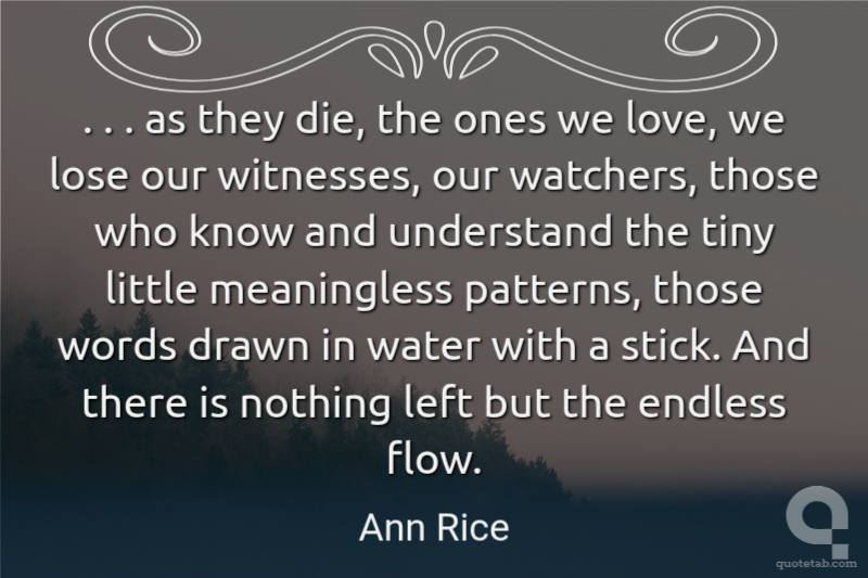 . . . as they die, the ones we love, we lose our witnesses, our watchers, those who know and understand the tiny little meaningless patterns, those words drawn in water with a stick. And there is nothing left but the endless flow.