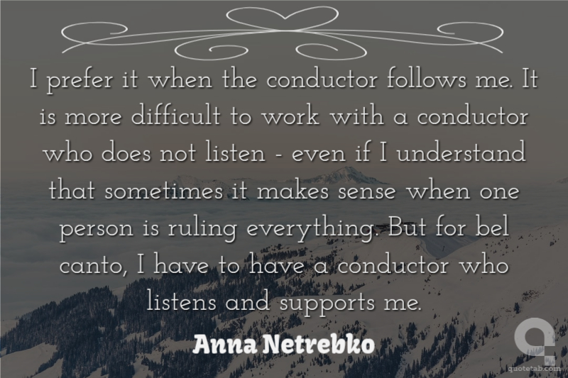 I prefer it when the conductor follows me. It is more difficult to work with a conductor who does not listen - even if I understand that sometimes it makes sense when one person is ruling everything. But for bel canto, I have to have a conductor who listens and supports me.