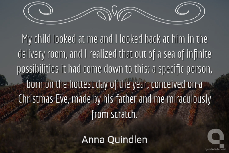 My child looked at me and I looked back at him in the delivery room, and I realized that out of a sea of infinite possibilities it had come down to this: a specific person, born on the hottest day of the year, conceived on a Christmas Eve, made by his father and me miraculously from scratch.
